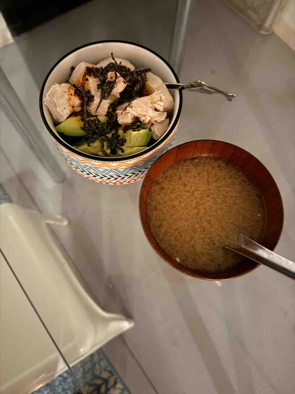 朝ごはんは白米に、鶏胸肉とアボカド。味噌汁!