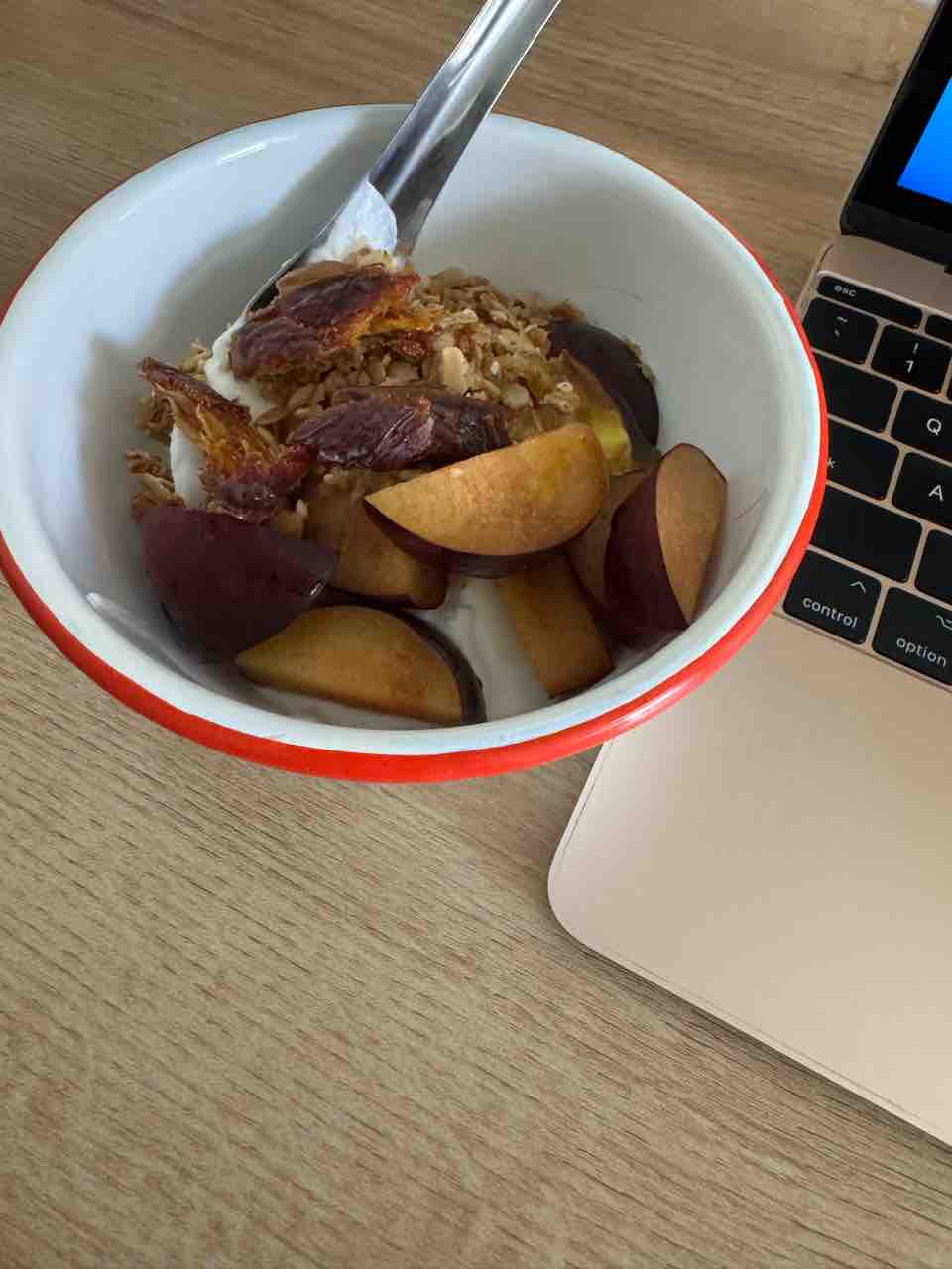 ギリシャヨーグルトにアナホラグラノーラ、デーツ、プラムでおやつ。