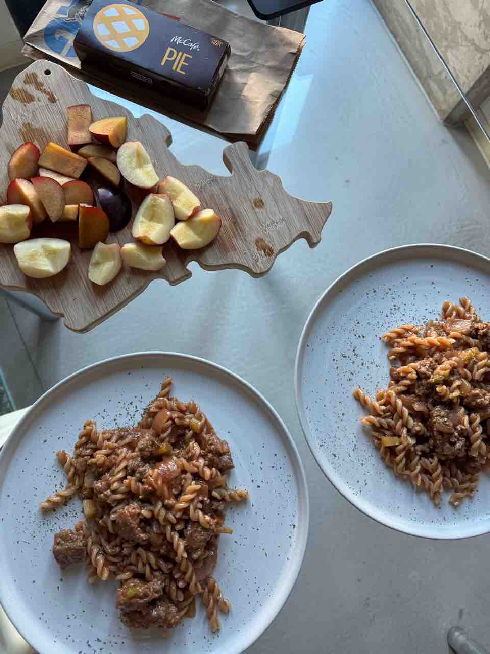 ディナーはクアロアランチのグラスフェッドビーフで作ったミートソースパスタ。