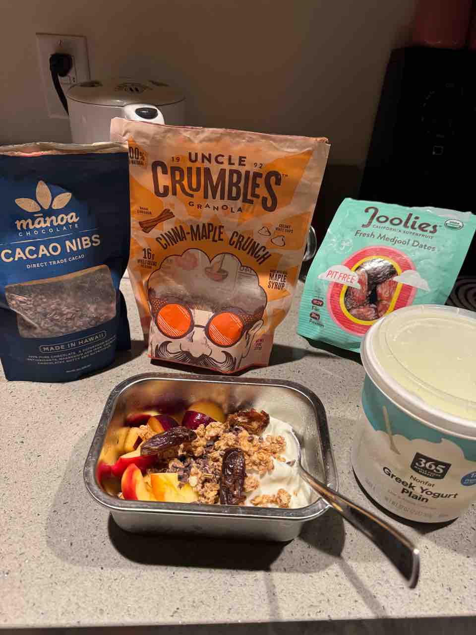 プラム、リンゴ、カカオニブ、グラノーラ、デーツ、ギリシャヨーグルト。