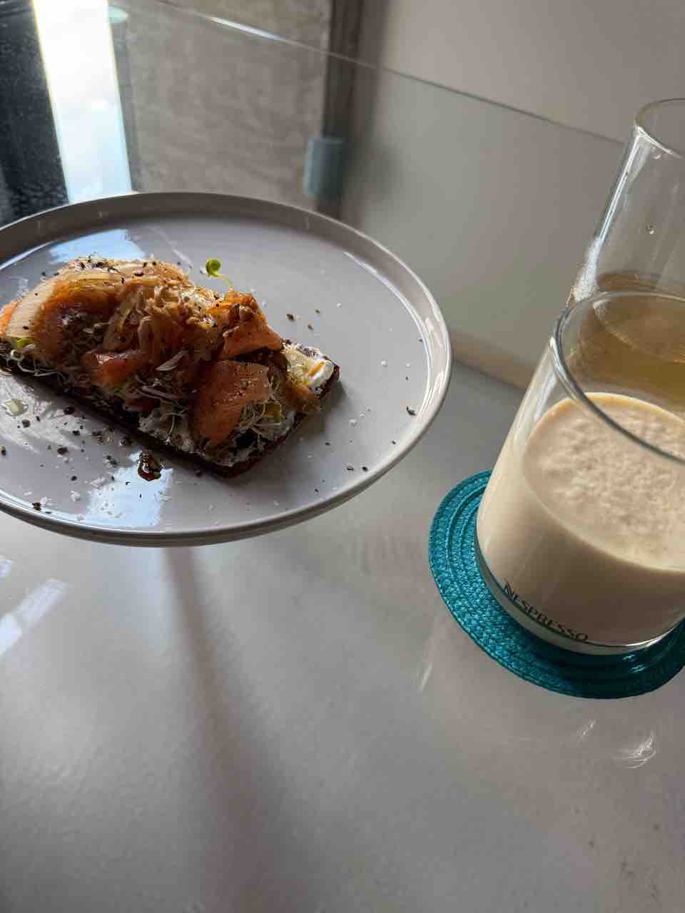 スプラウト、サーモン、蒸した玉ねぎと切り干し大根、エキストラバージンオリーブオイル、塩胡椒、ローカルのスパイシーハニー!