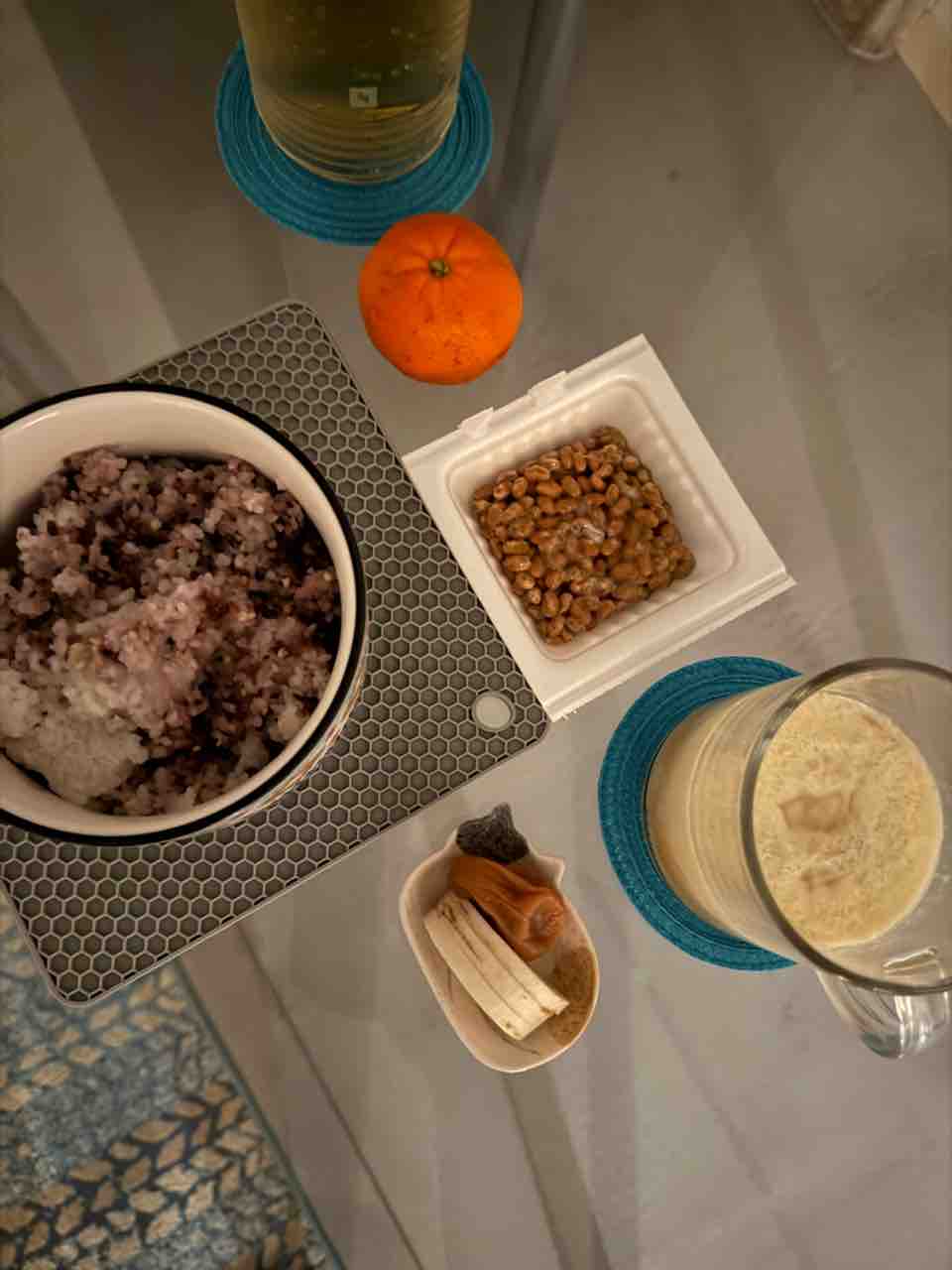 朝は雑穀米に、糠漬け、梅干し、チキン入りの茶碗蒸しもどき、納豆、みかん🍊