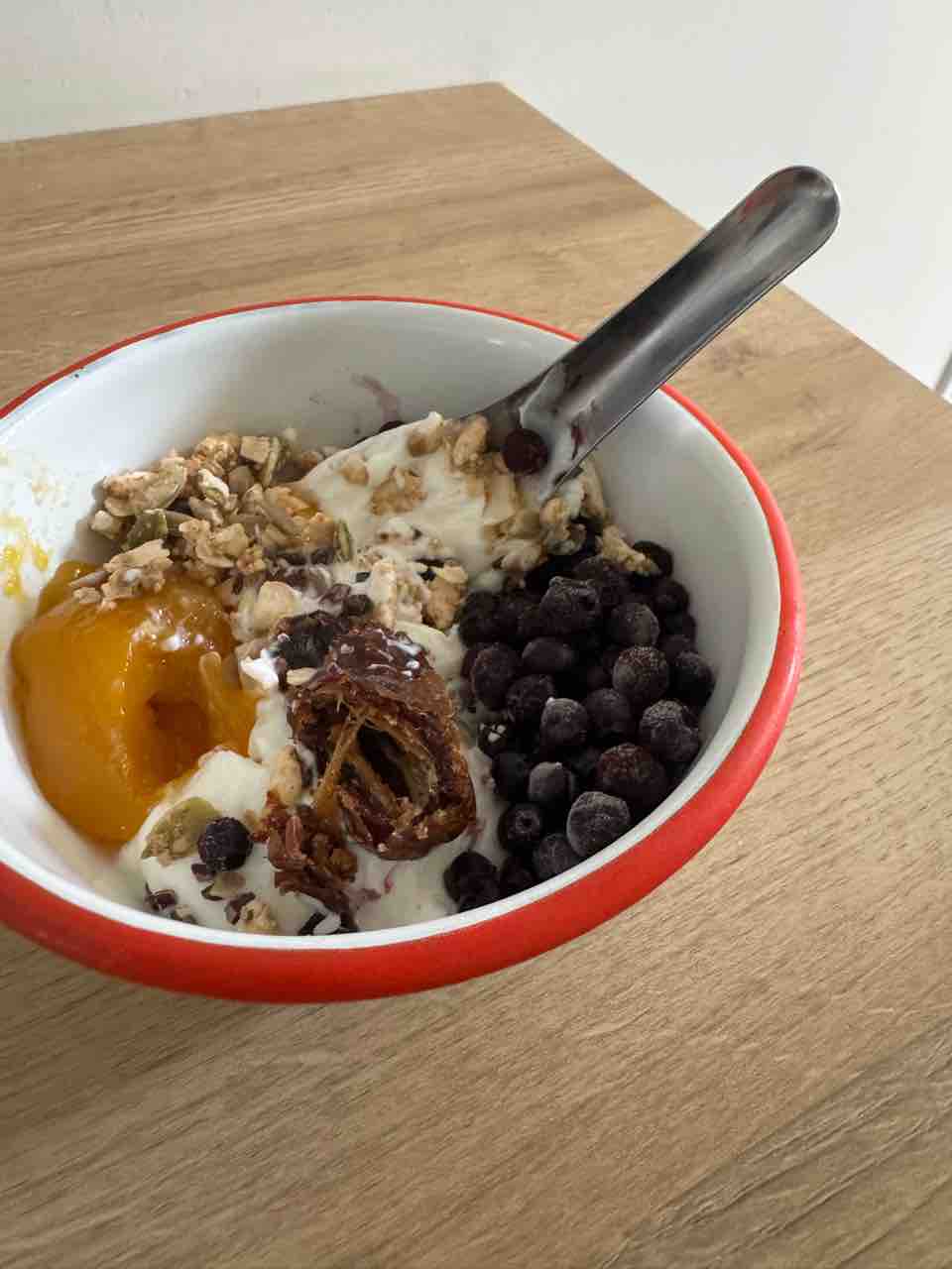 ギリシャヨーグルト、ワイルドブルーベリー、グラノーラ、マンゴージャム、デーツ、カカオニブ!