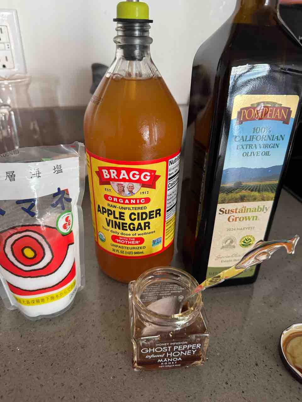 美味しい海塩、アップルサイダービネガー、エキストラバージンオリーブオイル、マノアハニーのちょっと辛いやつ!