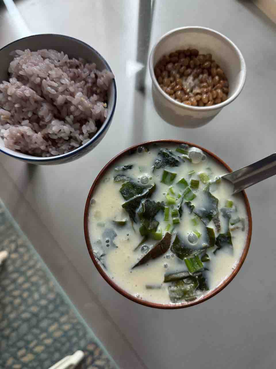 朝は炊き立て雑穀米に、納豆にオリーブオイルと旨塩、豆乳とわかめとネギのスープ。