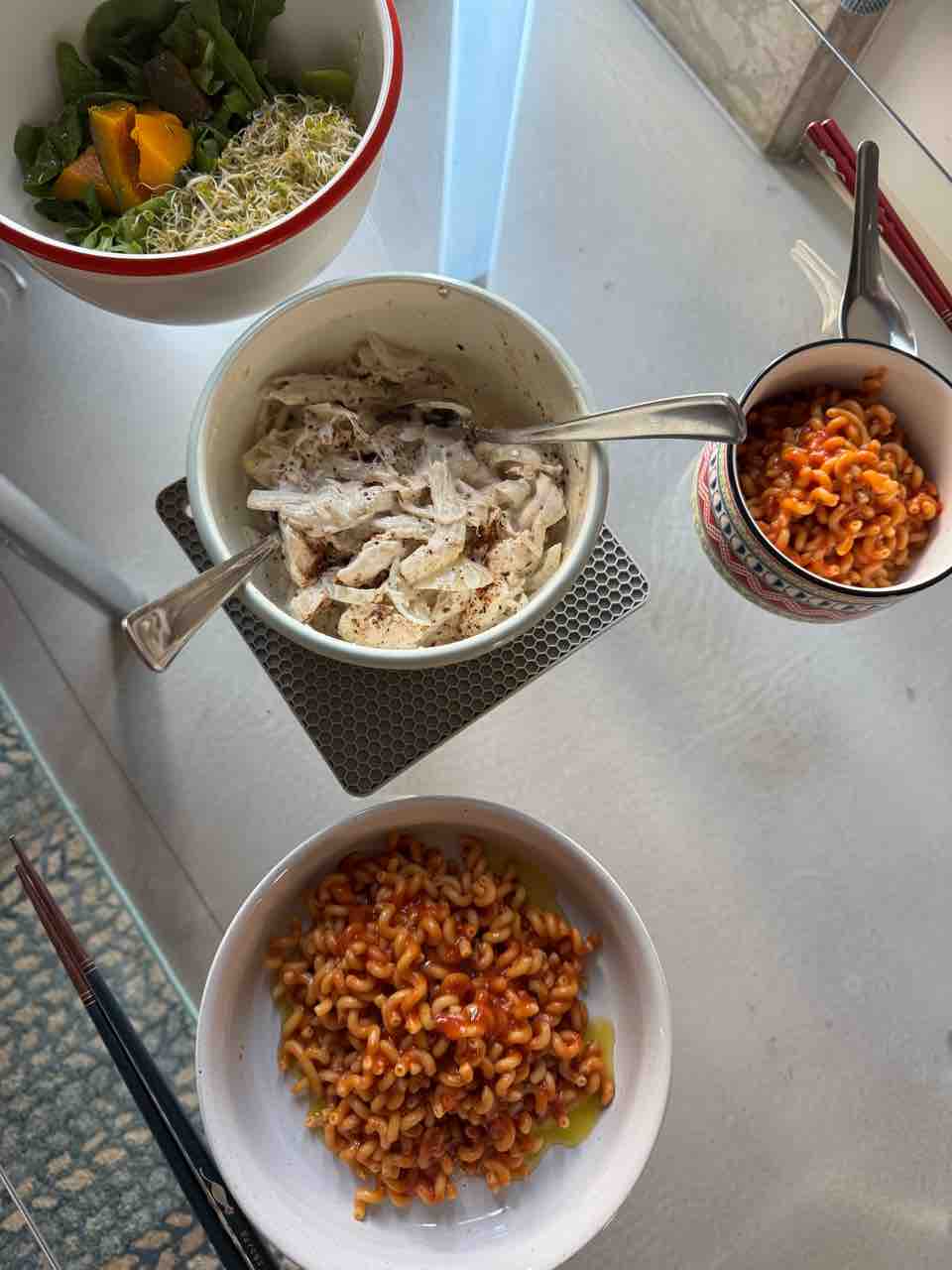 前日の残りの蒸し鶏は、蒸した玉ねぎとマヨネーズと七味と和えてサラダにしました。