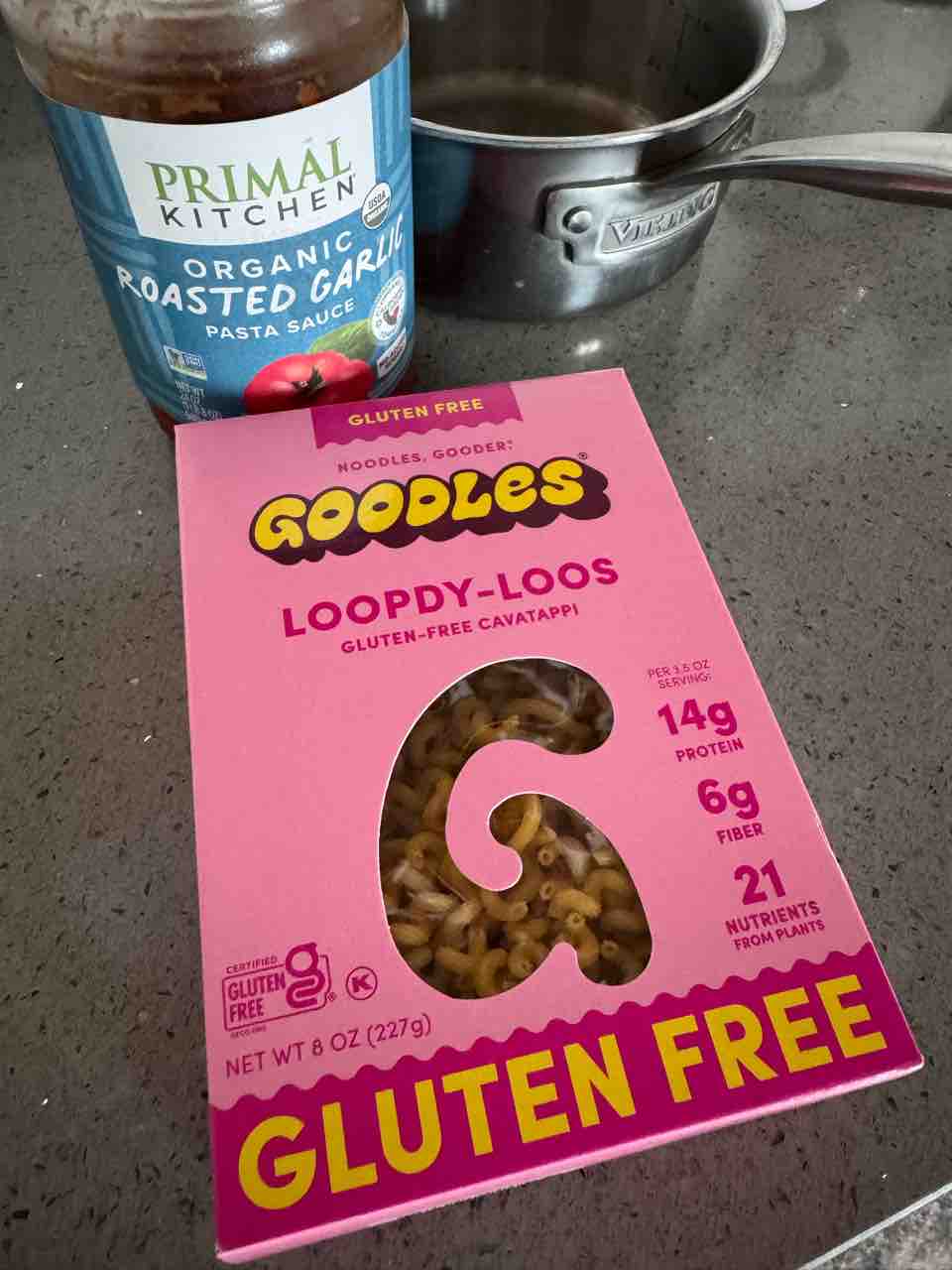 パスタはプライマルキッチンのソースと、Goodlesのグルテンフリーの高タンパクパスタ。