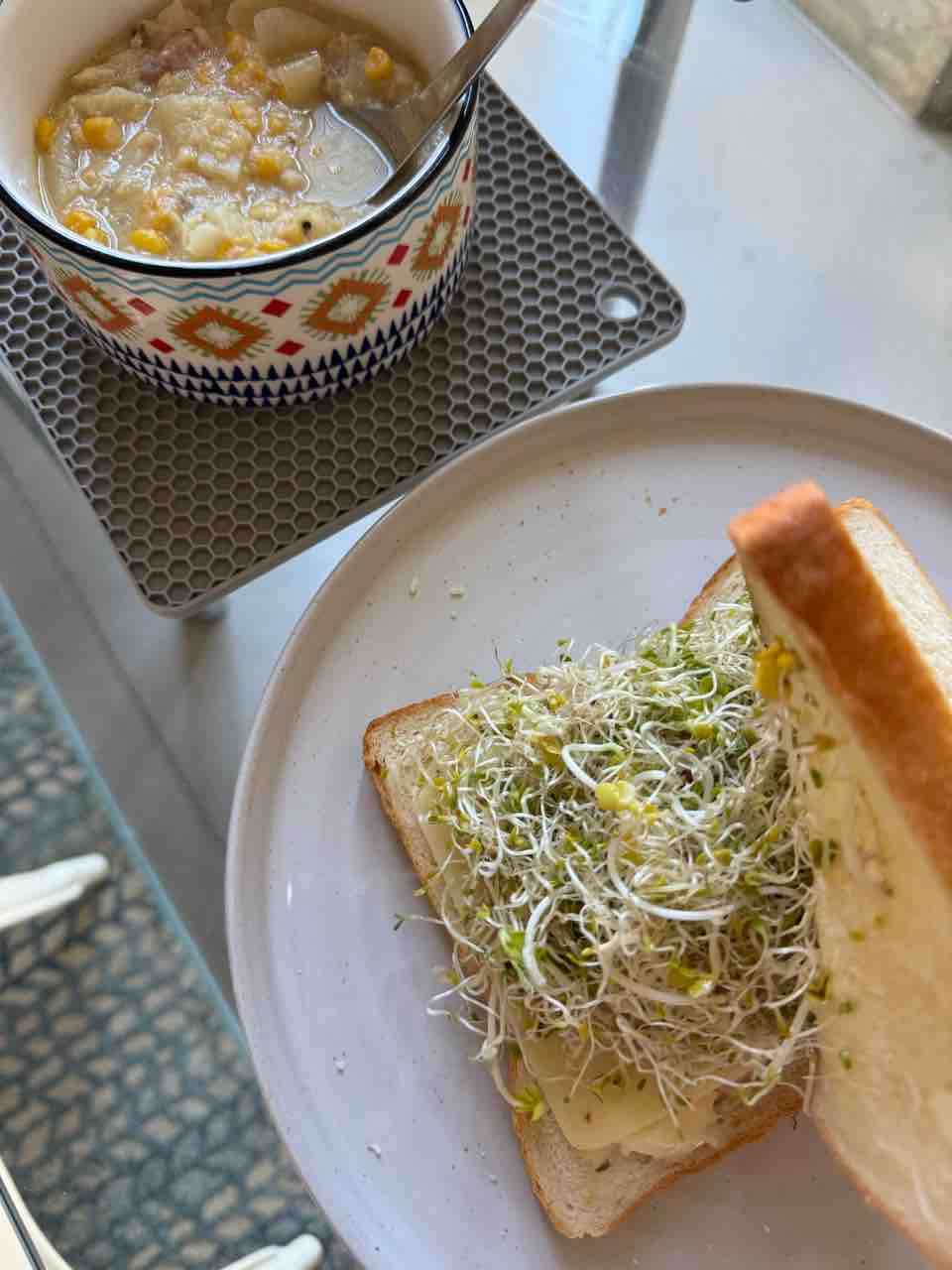 ランチはチキンとコーンのチャウダーに、チーズとスプラウトのサンドイッチ😚