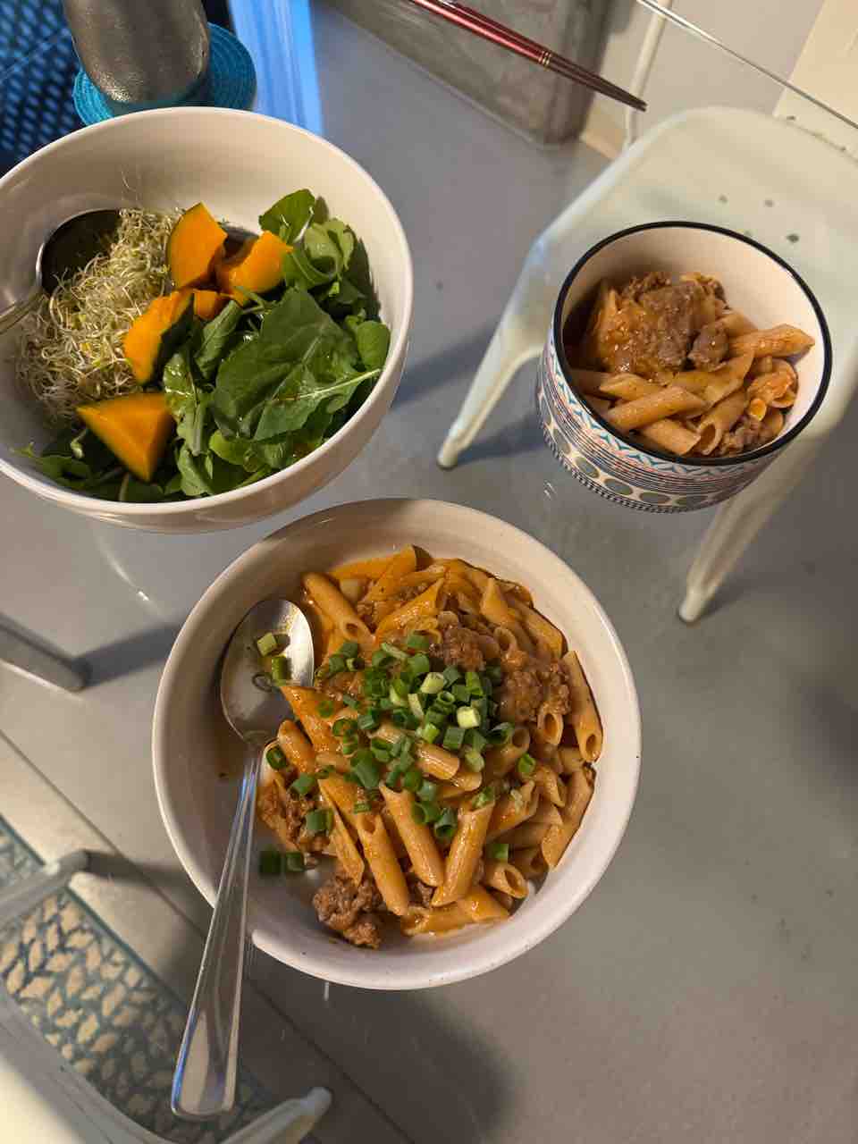 夜ご飯は、クアロアランチのグラスフェッドビーフを使ってミートソースを作りました。