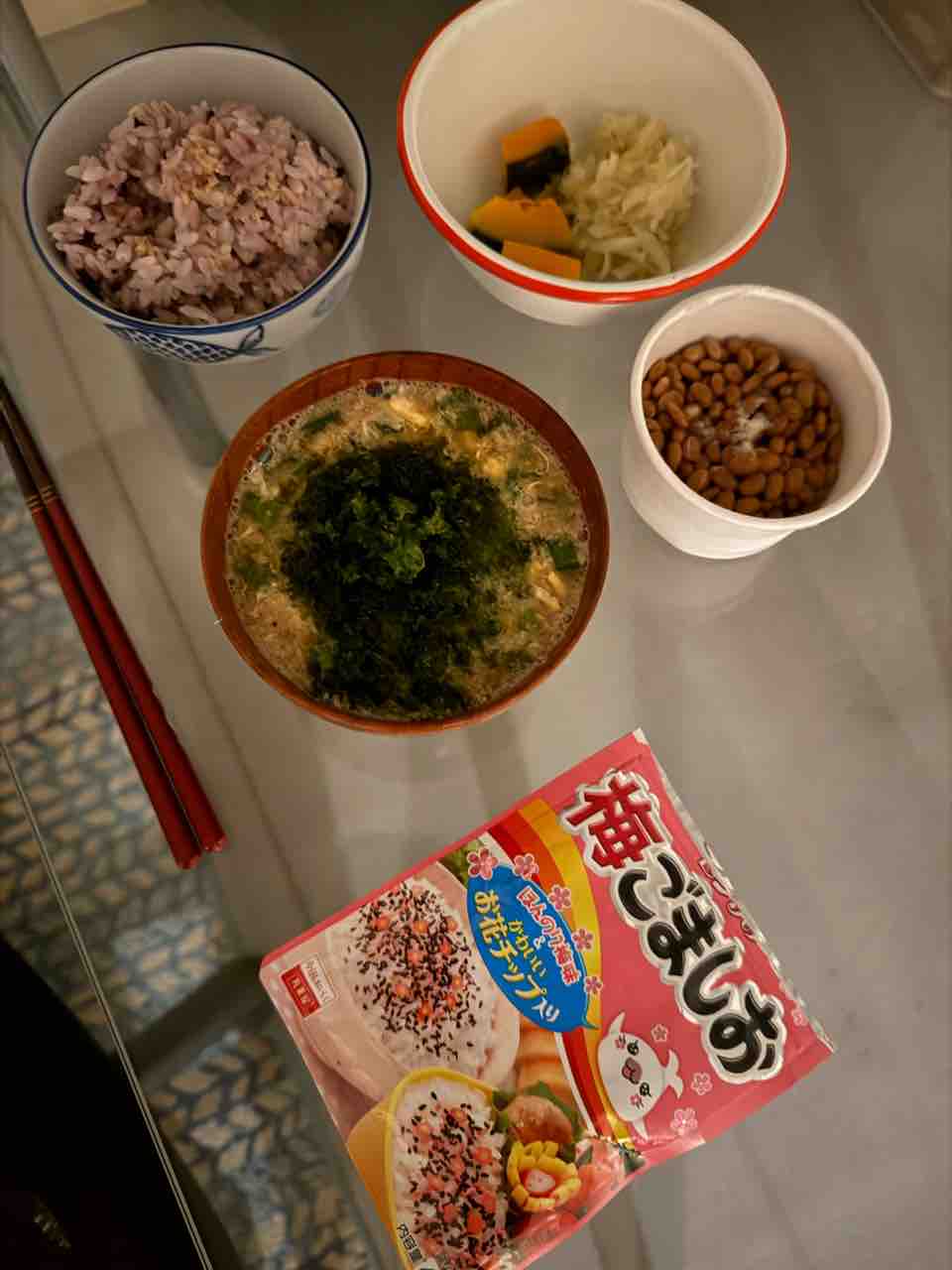 炊き立ての雑穀米と卵の味噌汁、かぼちゃとザワークラウト、納豆😝