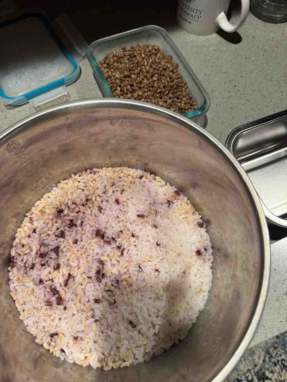 雑穀米に発芽させて蒸したレンズ豆を加えて