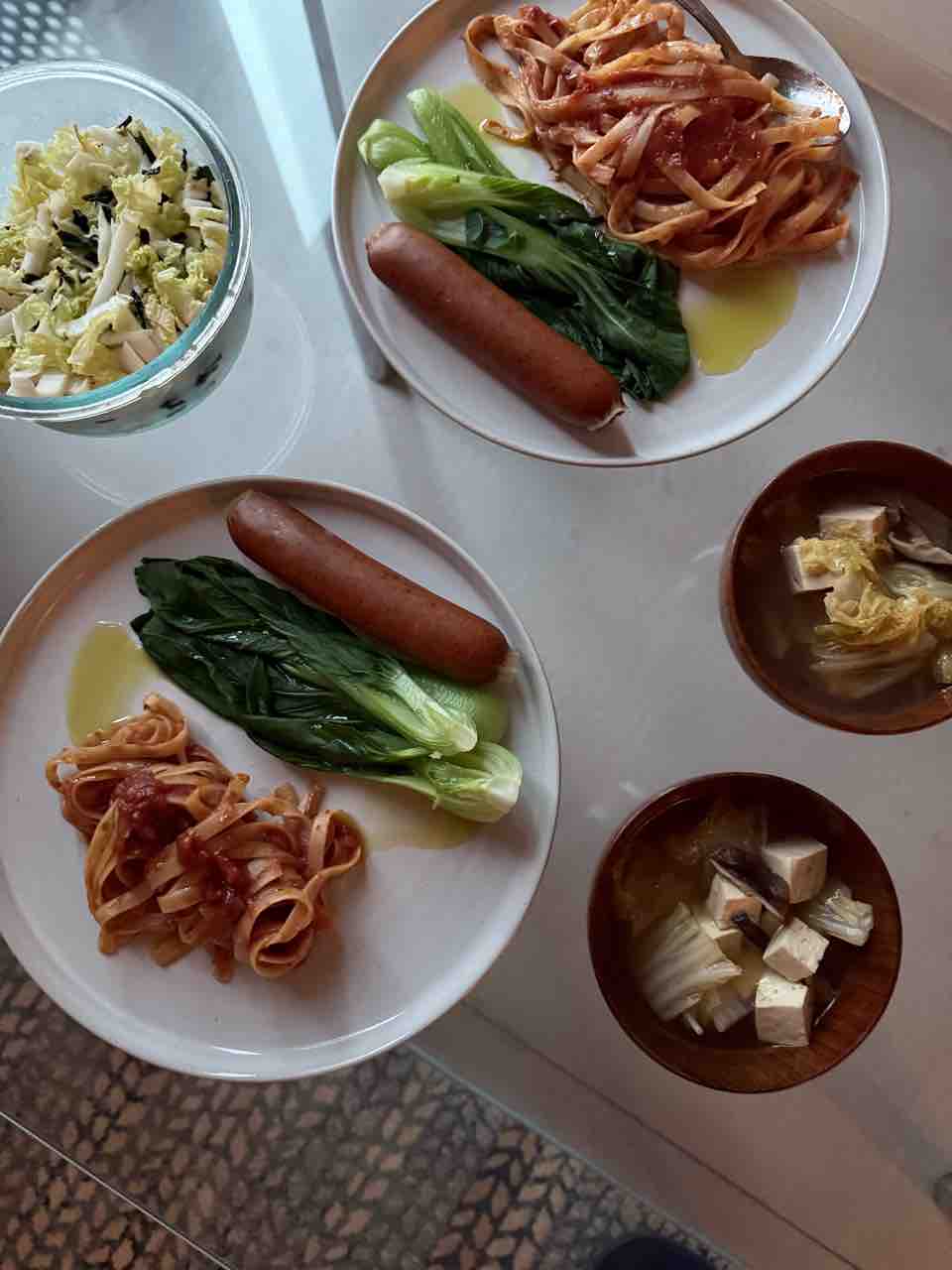 夜ご飯はパスタとチキンソーセージ、青梗菜。