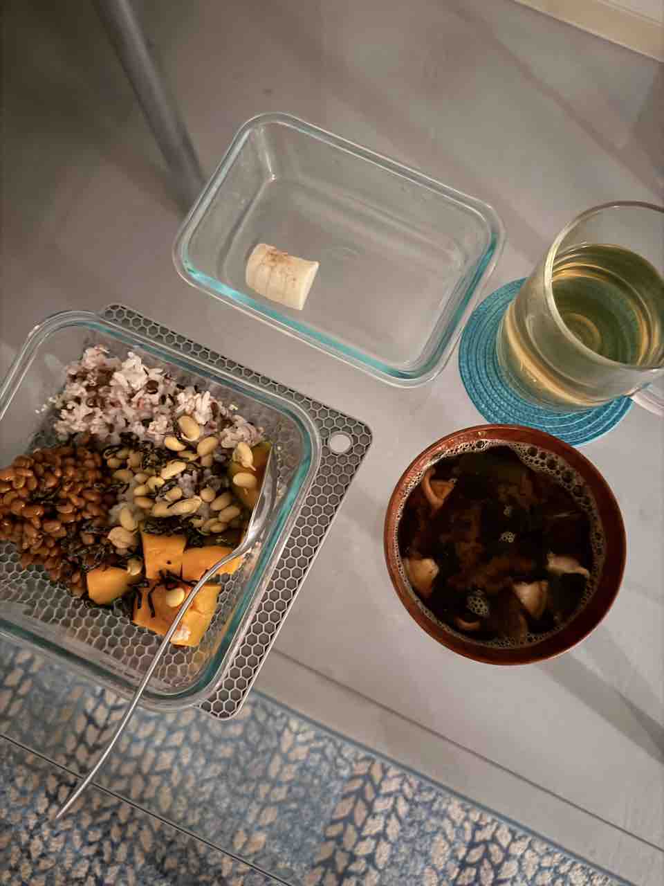 朝はレンズ豆入りの雑穀米、大豆、かぼちゃ、納豆!