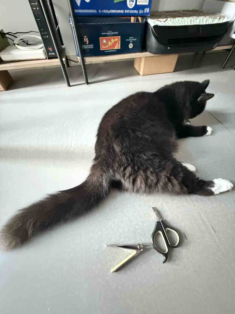 いつも同じタイミングでやってます。「ニンゲンも切るんだから公平ですにゃ」と語りかけてます。