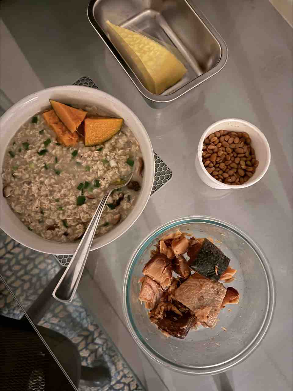 朝は椎茸とネギ入りのオートミールにかぼちゃ、納豆、サーモン。