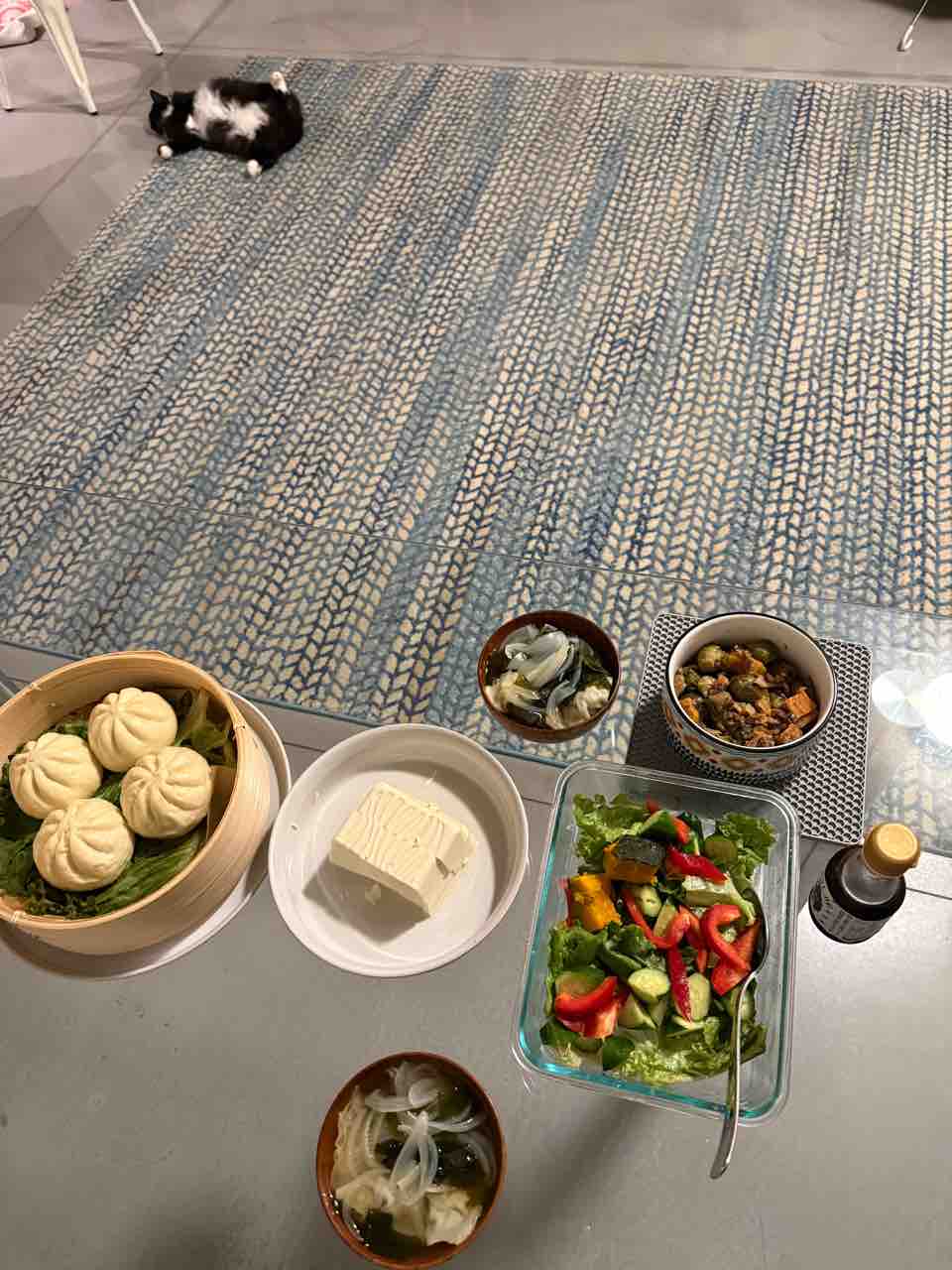 ディナーは、肉まんと、ワンタンスープ、アロハ豆腐、サラダ!