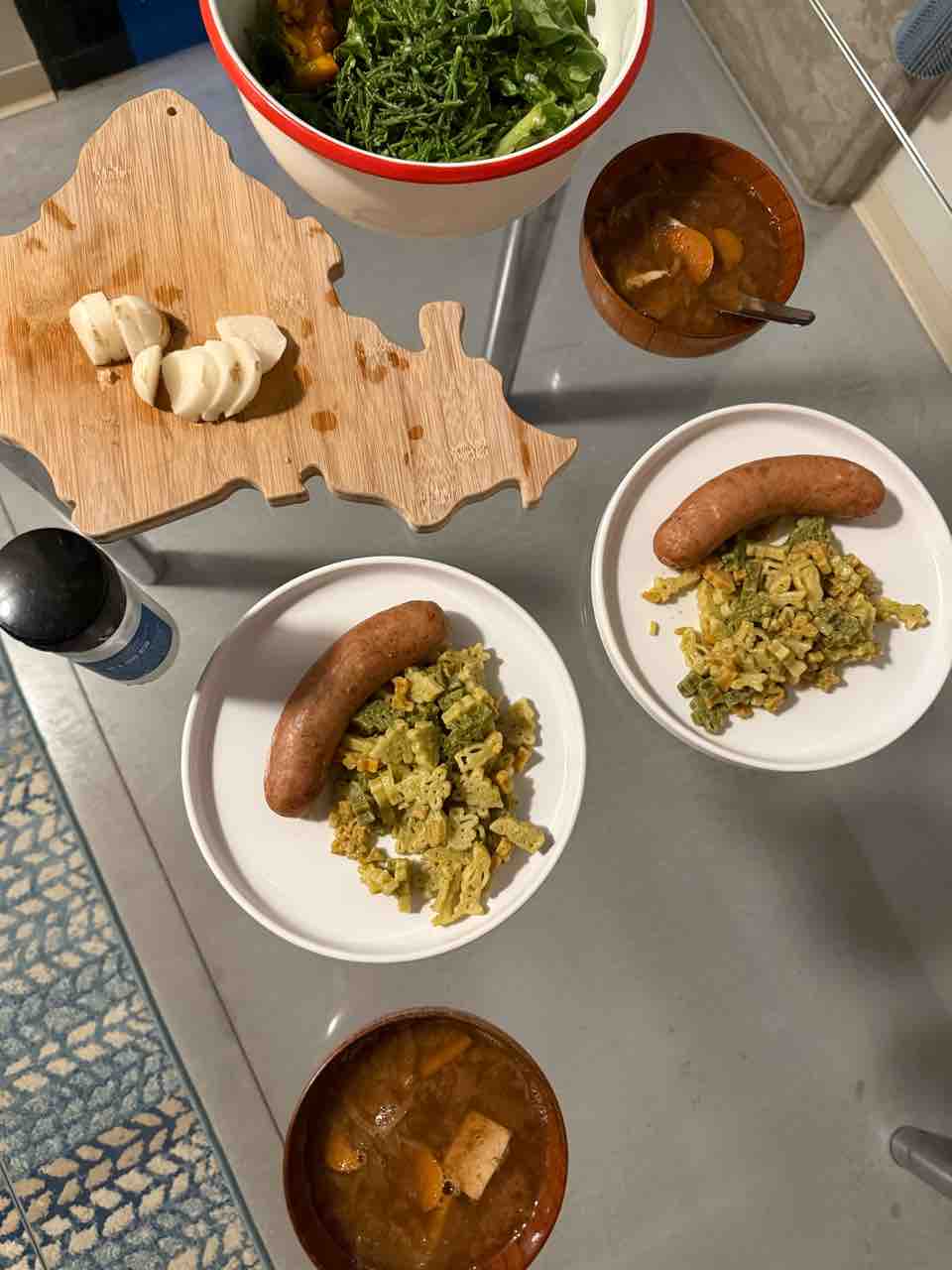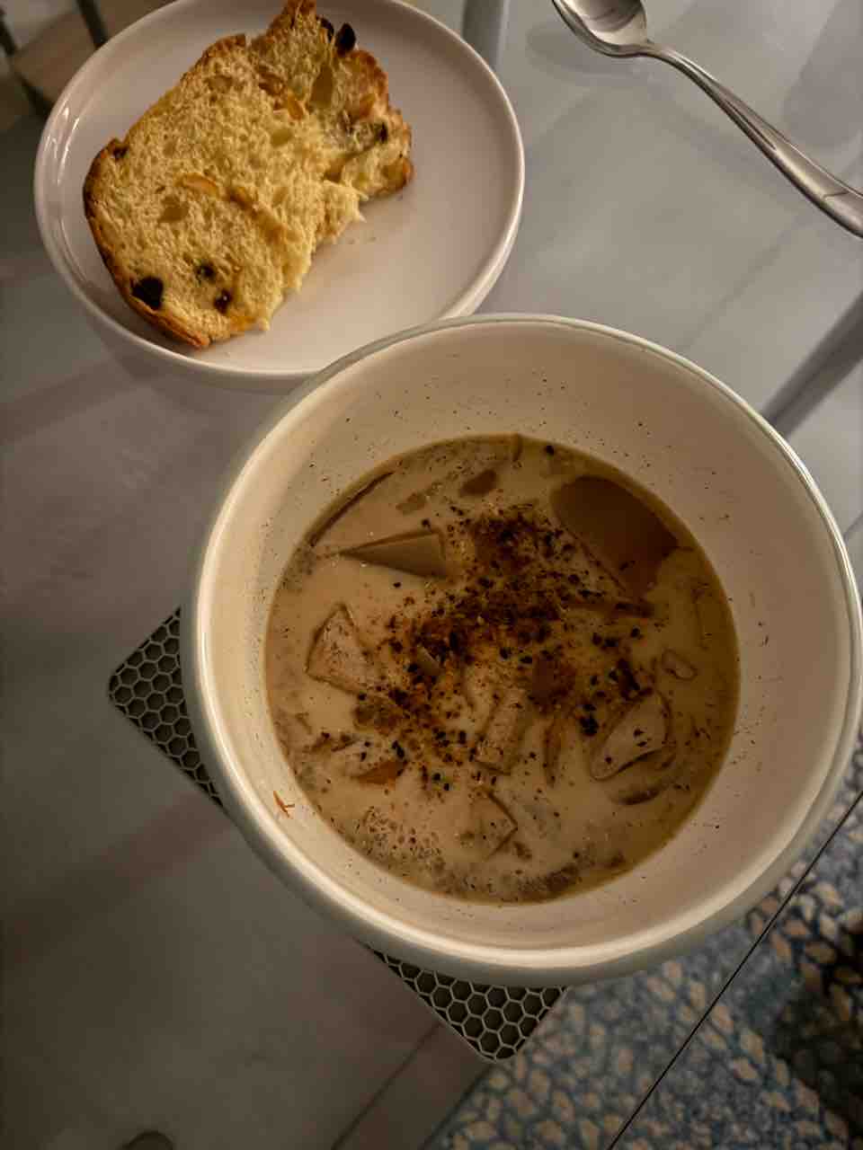 朝は具沢山味噌汁に卵を入れて混ぜて蒸した、謎の味噌汁茶碗蒸し。