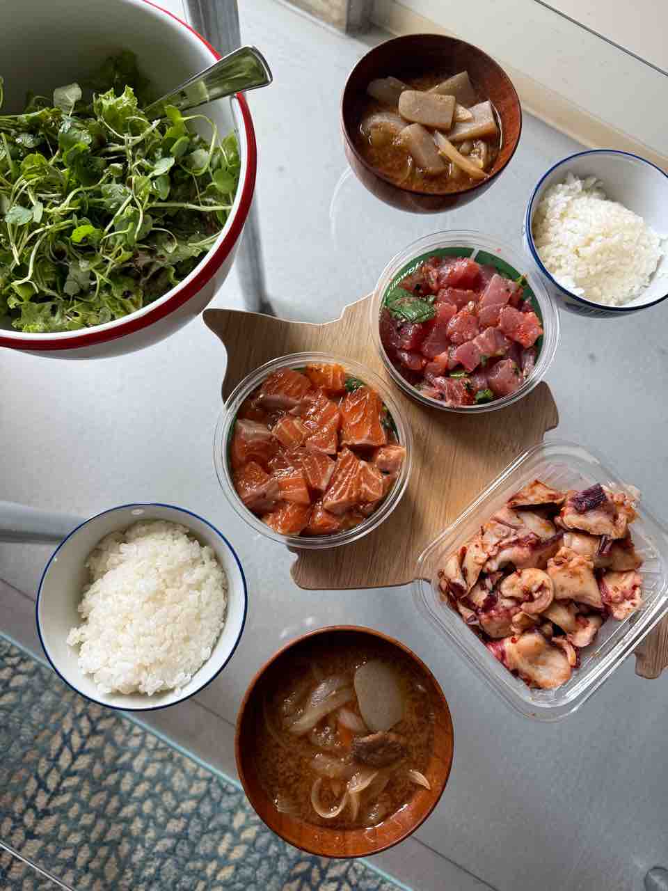 ポケと酢飯130g、具沢山味噌汁、レタスとウォータークレスのサラダ。