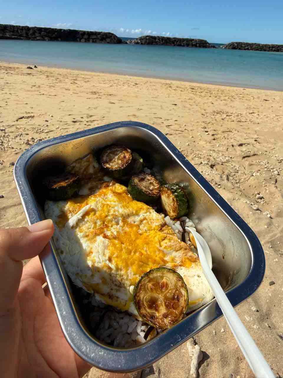 雑穀&大豆入りの白米150gに、卵1.5個、ズッキーニ。