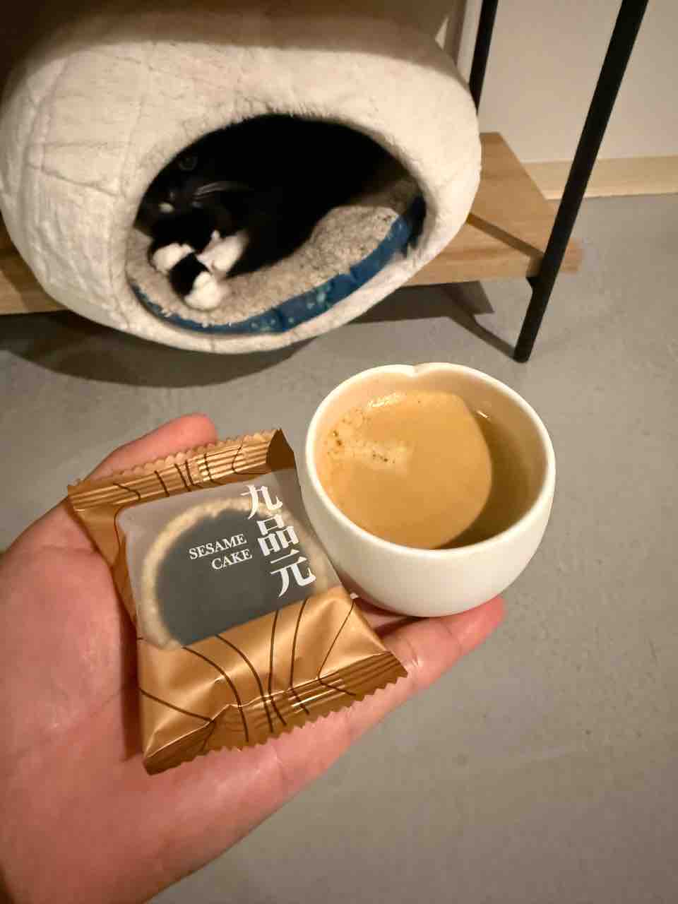 夜のおやつにディカフェのエスプレッソと、台湾土産の胡麻のお菓子!