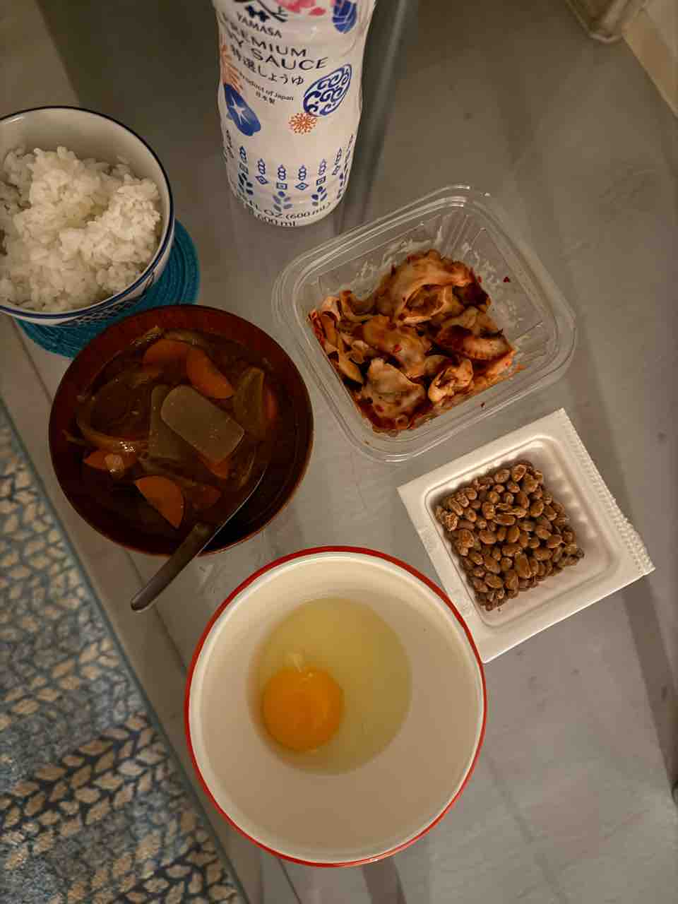 白米150g、具沢山お味噌汁、たこポケ、納豆、生卵!
