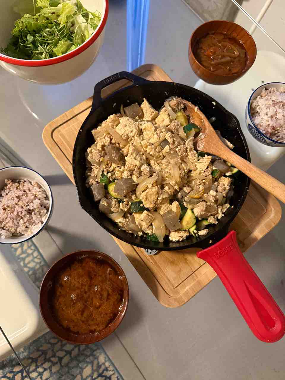 玉ねぎとズッキーニとコンニャク入り。とにかく食べまくりたくて蒟蒻でかさ増し!