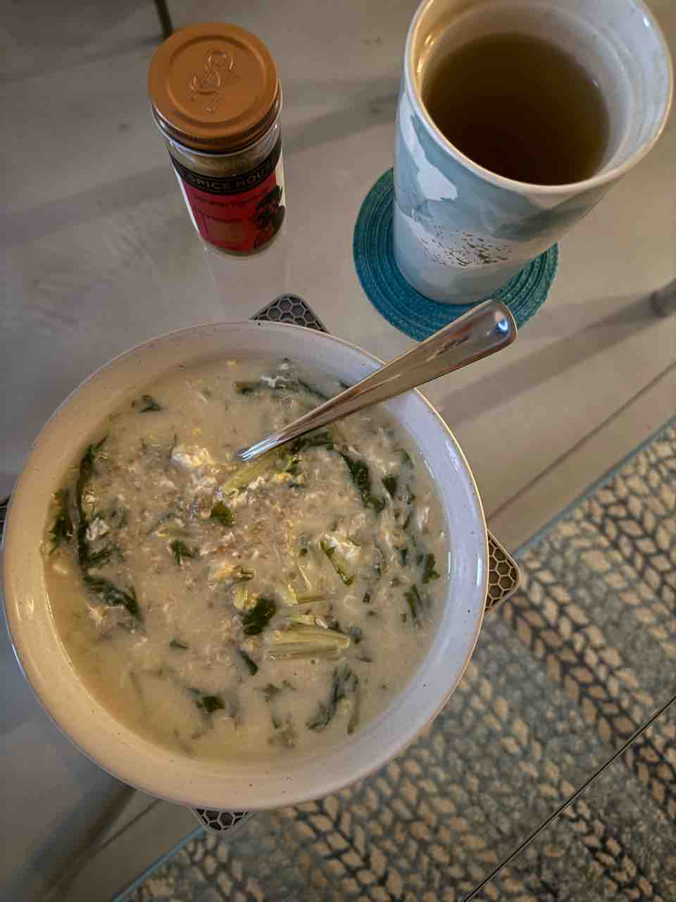 豆乳と卵と水菜のスチールカットオーツ粥で朝ごはん。