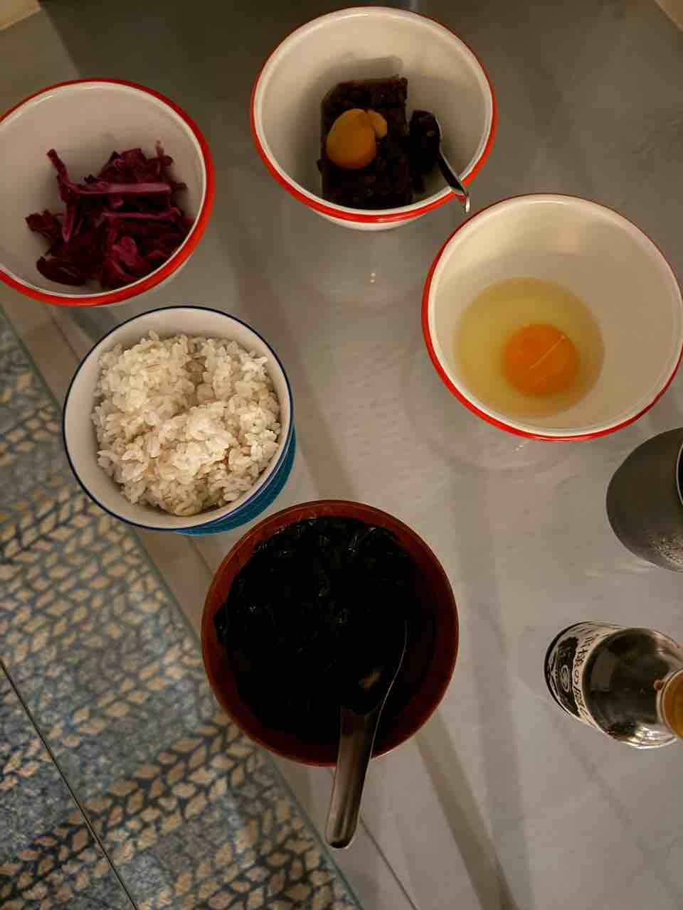 朝ごはんは白米150g、生卵、ワカメスープ、キャベツのマリネ、小豆と栗!