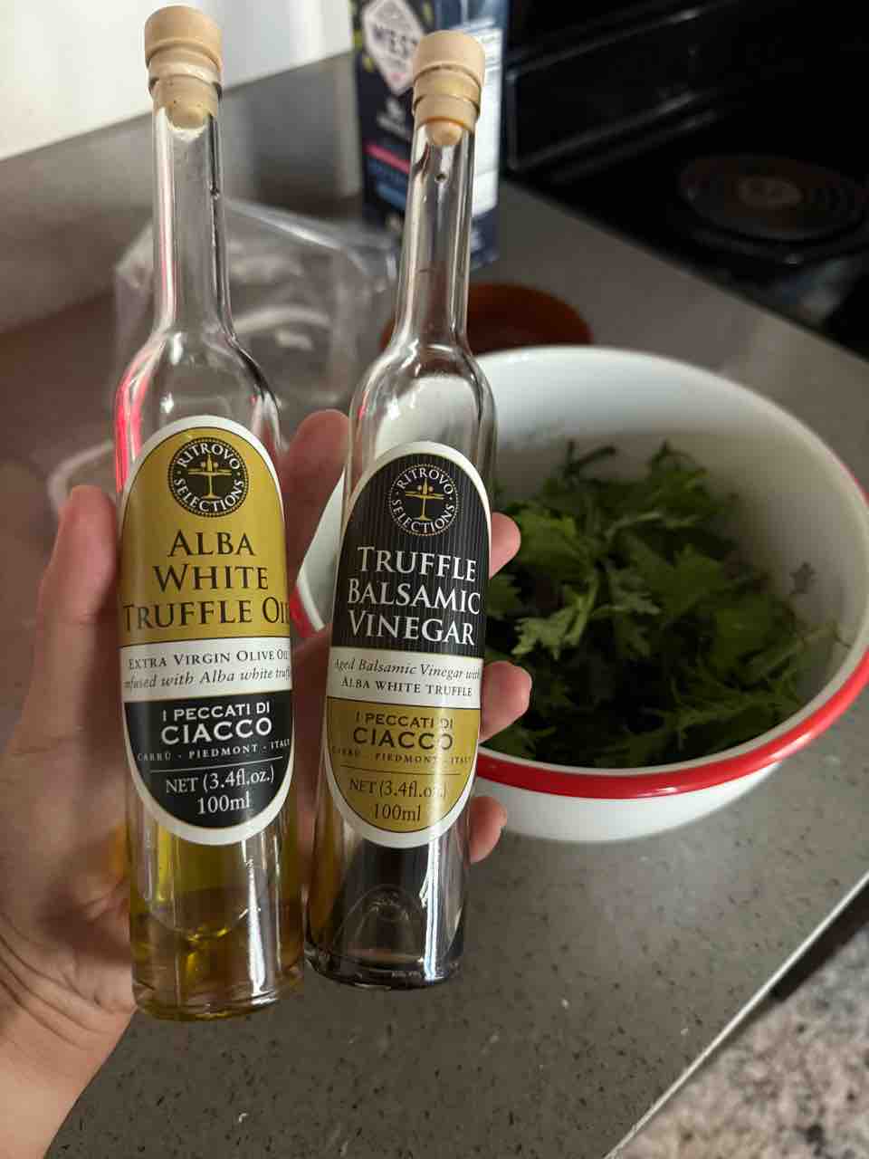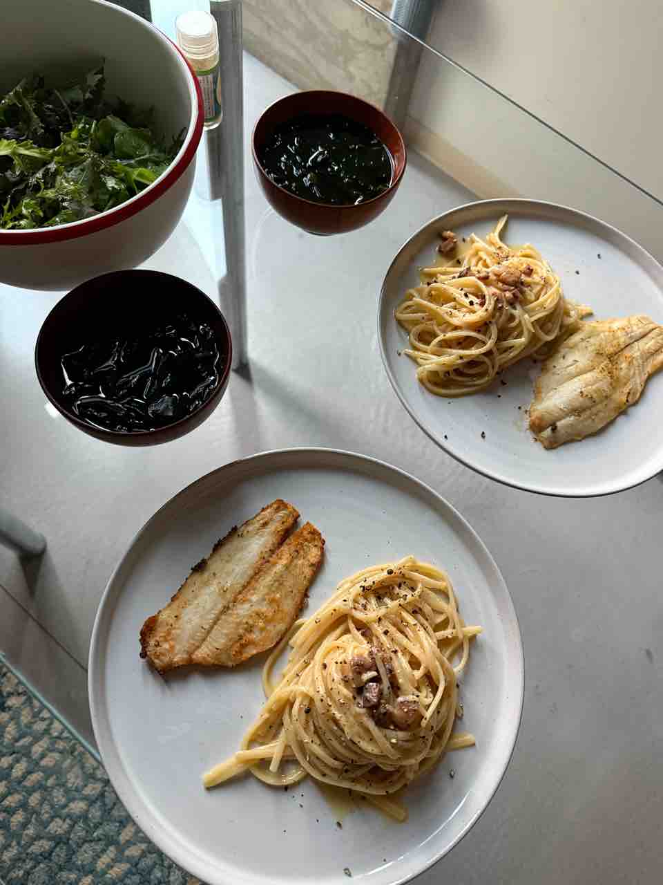 ディナーはサラダとワカメスープ、カルボナーラ、お魚。