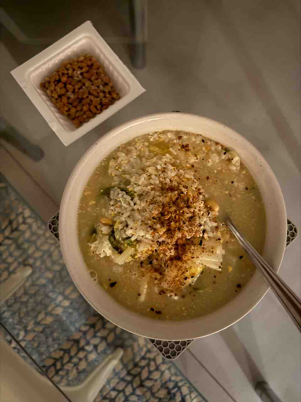 朝は卵と白菜と水菜の雑炊、納豆。