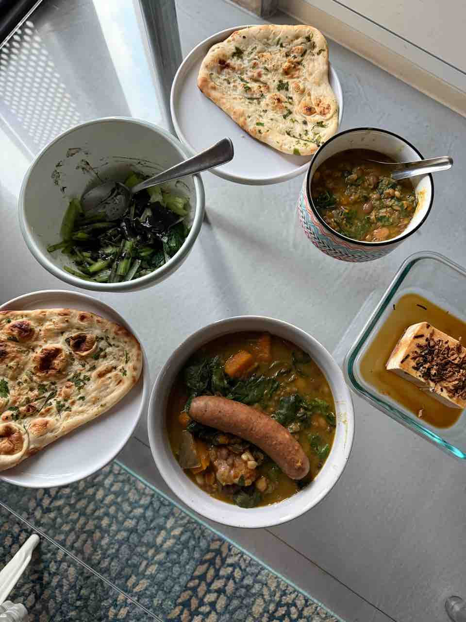 豆カレー、ナン、Tatsoiの胡麻和え、お豆腐。