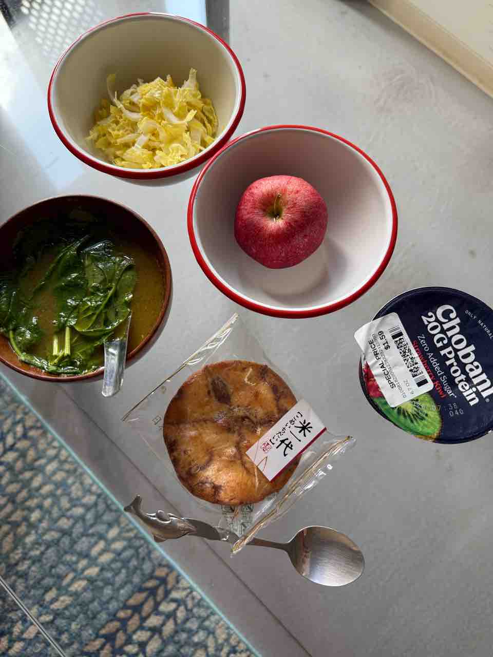白菜とゆずの浅漬け、オーガニックりんご、20gプロテインのギリシャヨーグルト、お煎餅。
