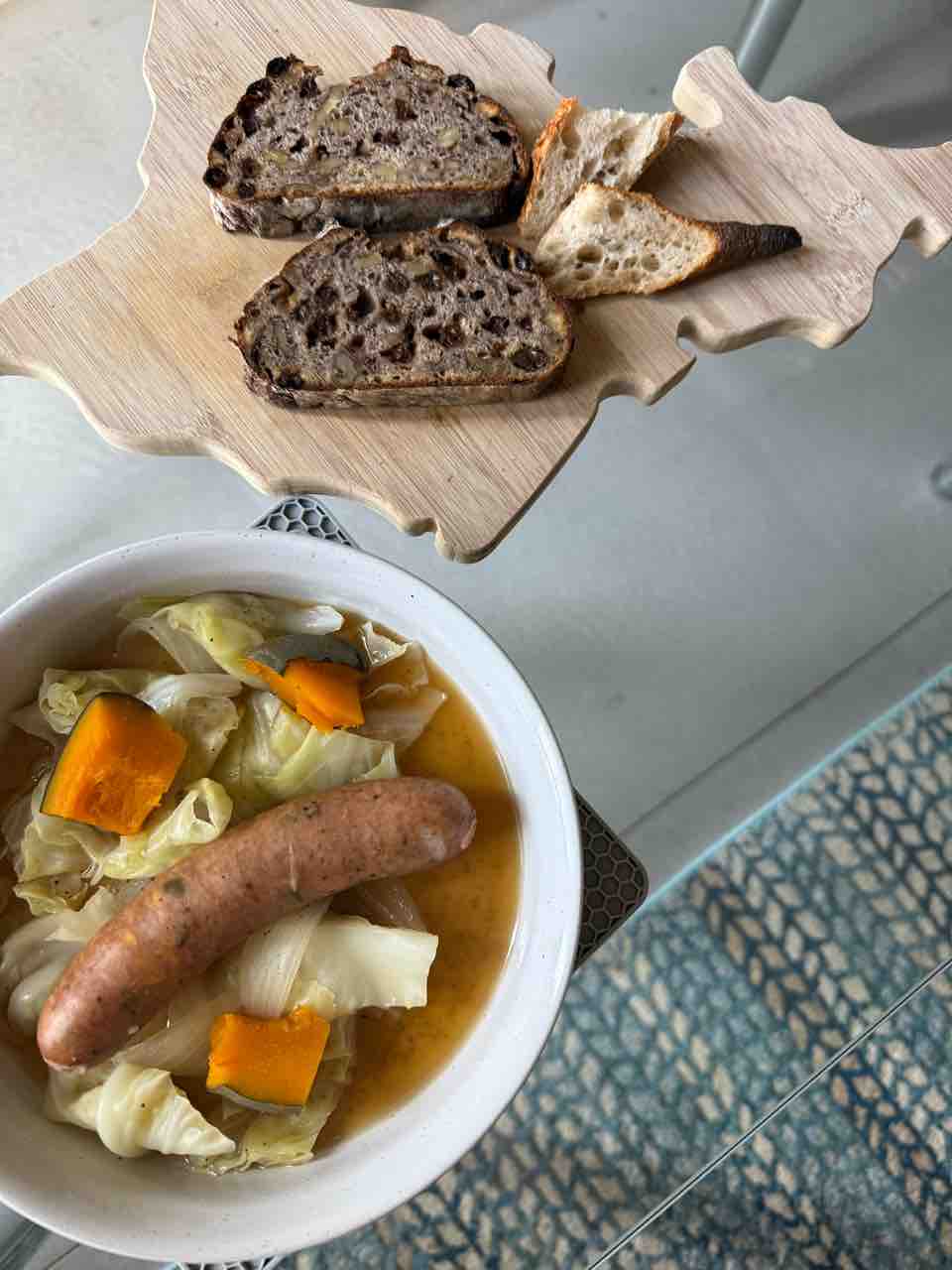 キャベツと玉ねぎとかぼちゃのスープにチキンソーセージと、パンたち。