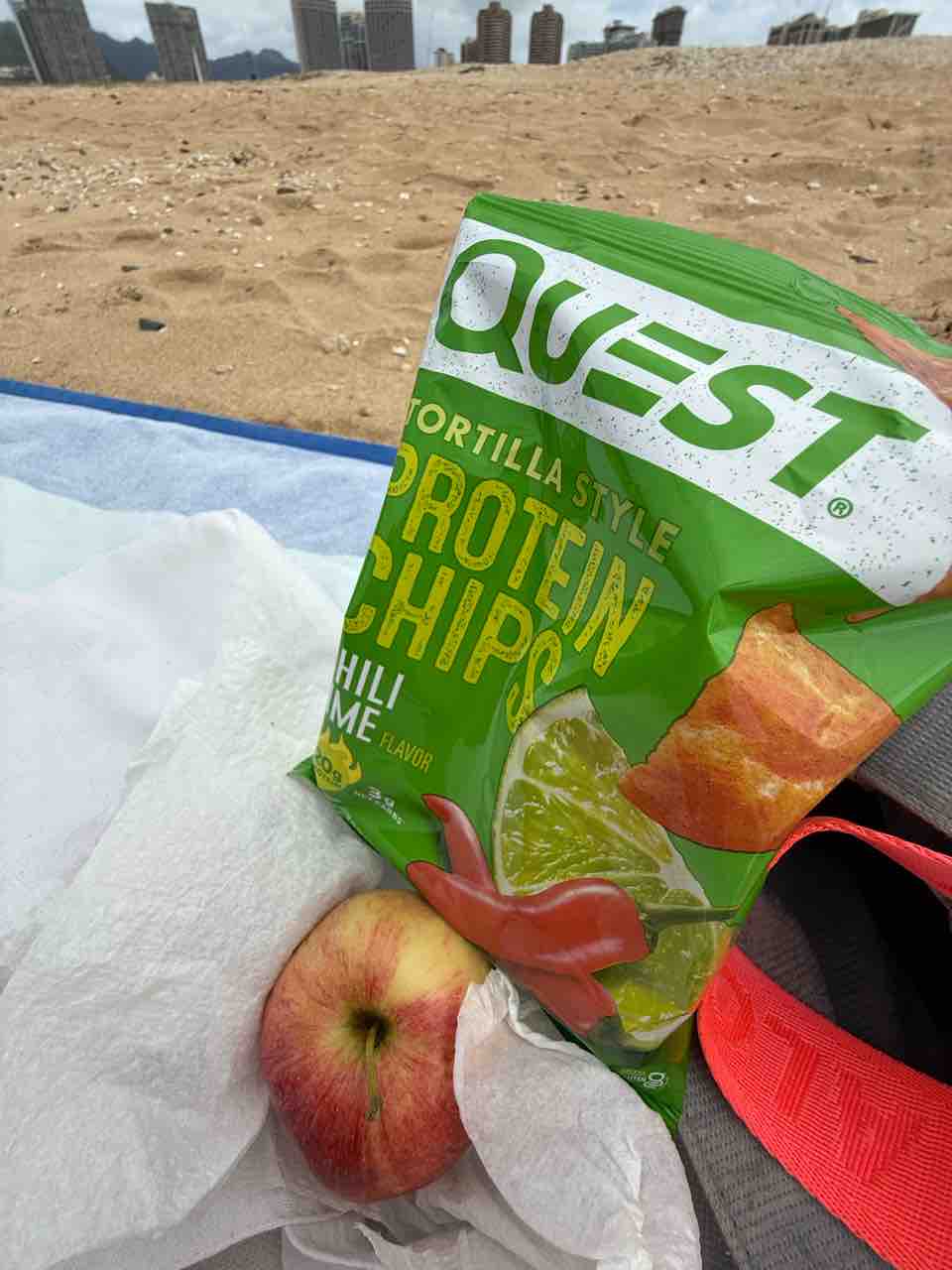 ビーチでリンゴとプロテインチップス!