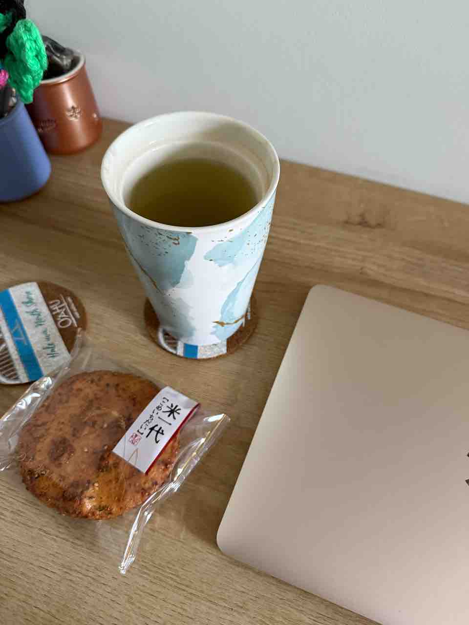 お煎餅と緑茶でオヤツタイム!