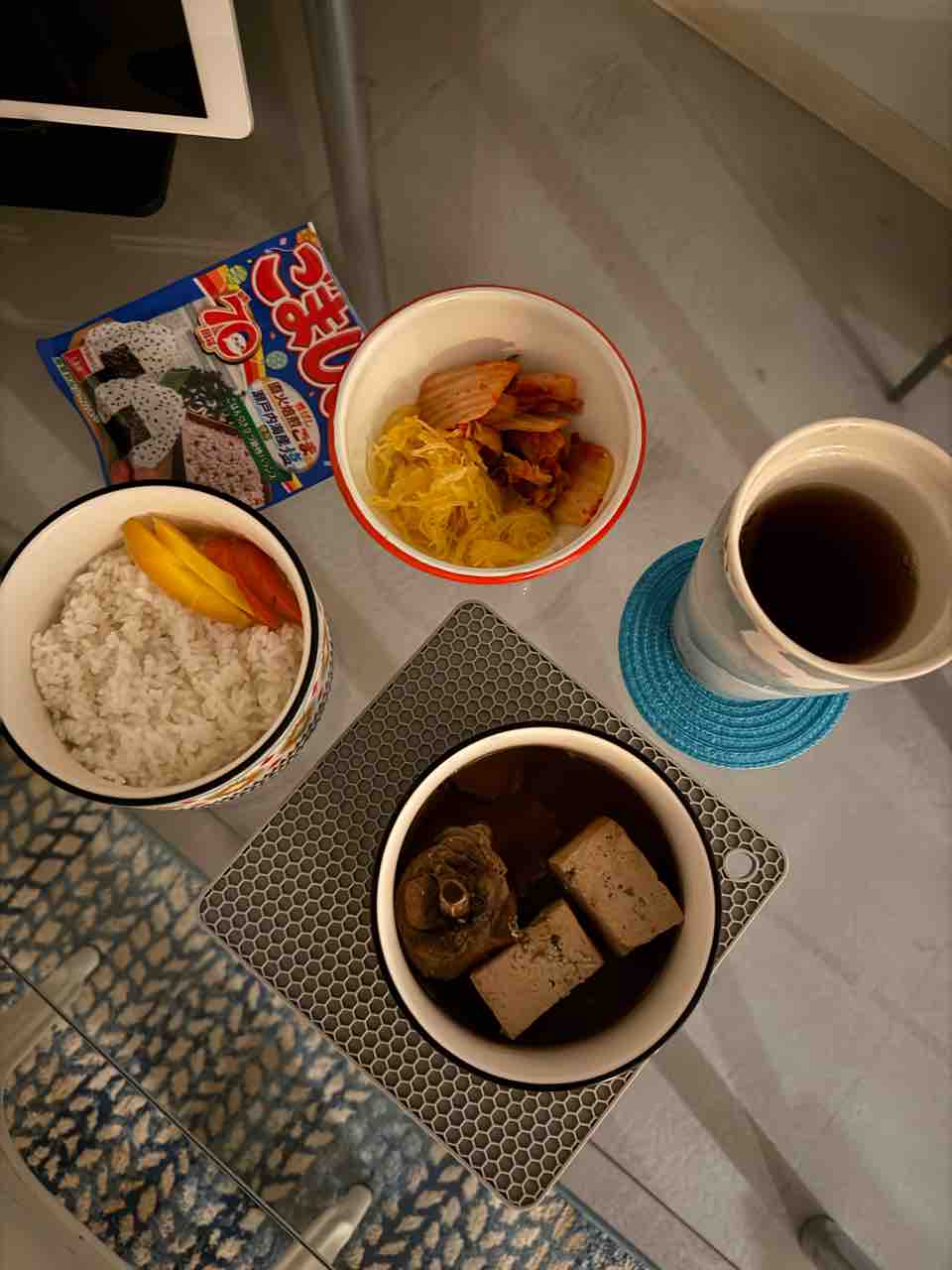 朝は白米150gに糠漬け、キムチとスパゲティスクワッシュ、お豆腐と鶏肉の煮込み、ほうじ茶!