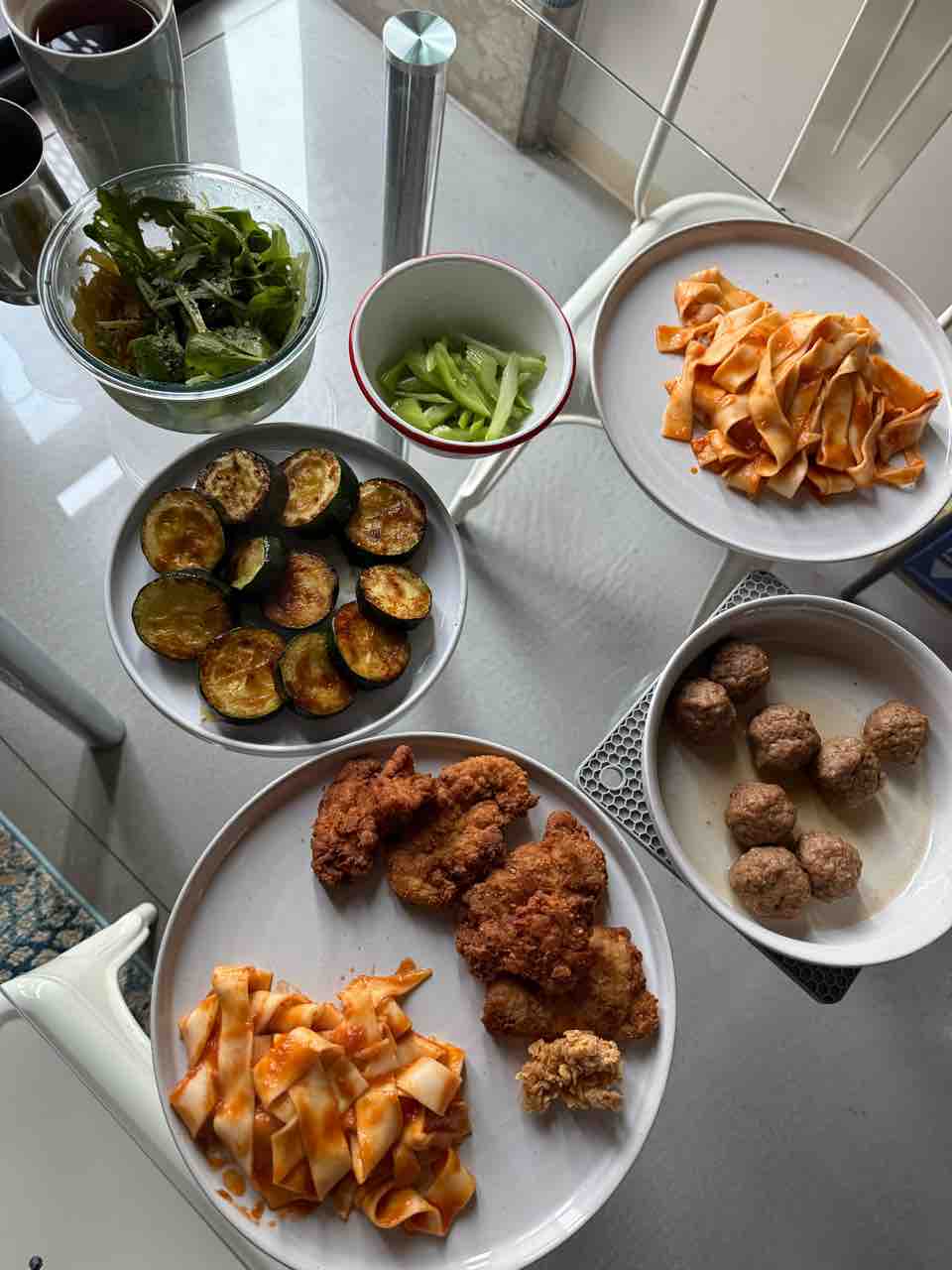 スパゲティスクワッシュと葉っぱのサラダ、セロリの浅漬け、パスタ、ズッキーニのバター醤油焼き、照り焼きミートボール。
