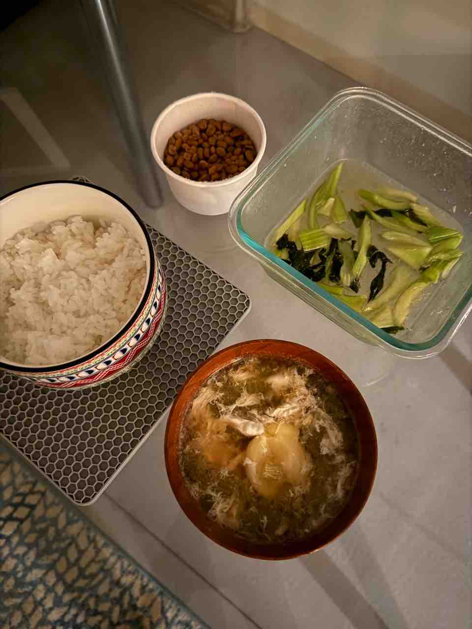 白米150g、アロハ豆腐の納豆、セロリとわかめの浅漬け、卵いり野菜スープ。