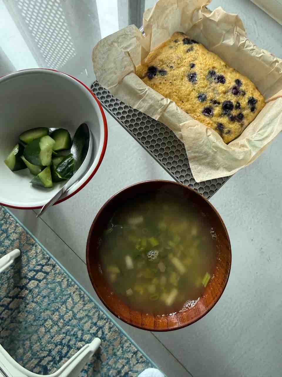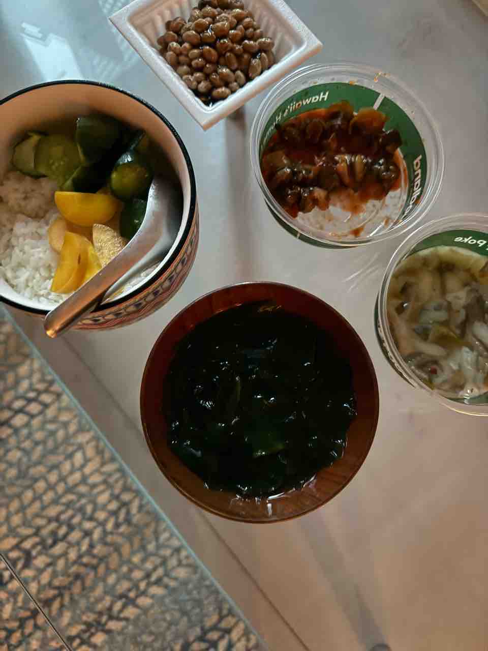 朝は白米150g、糠漬け、納豆、貝のポケ、イカわさ、わかめのスープ。