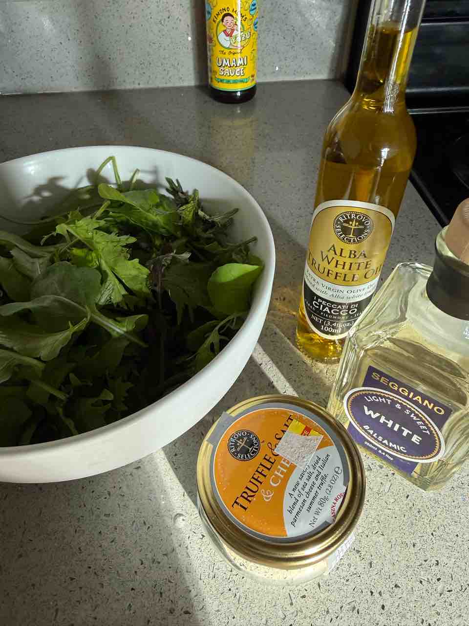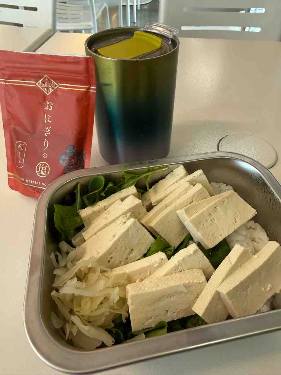 お弁当は白米150g、ベビーリーフ、ザワークラウト、お豆腐。ごま油とお塩!