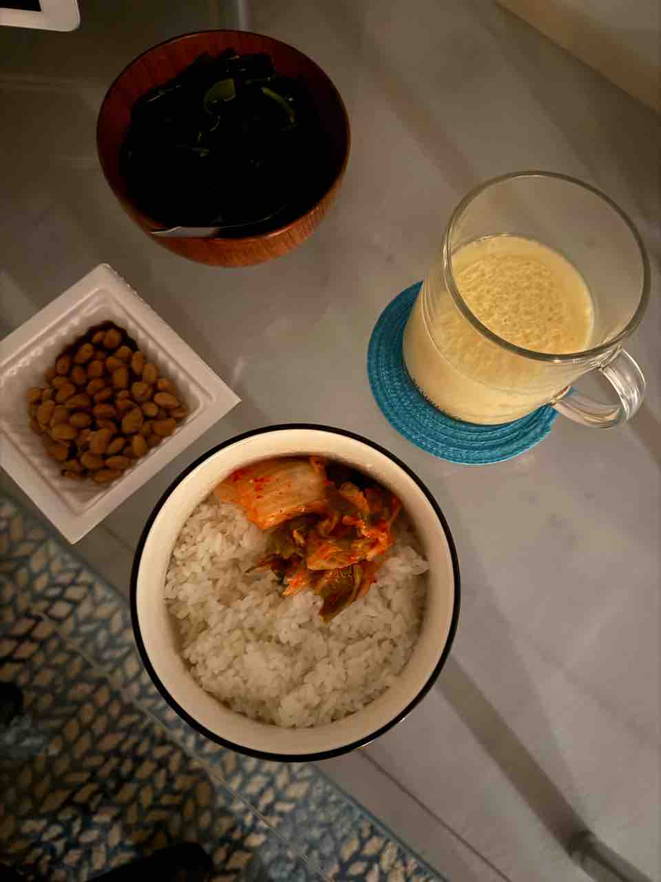 朝は白米150g、キムチ、納豆、わかめスープ、茶碗蒸しもどき!
