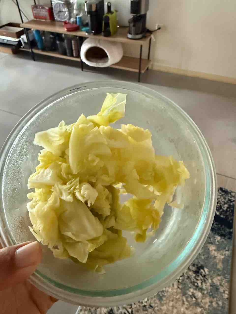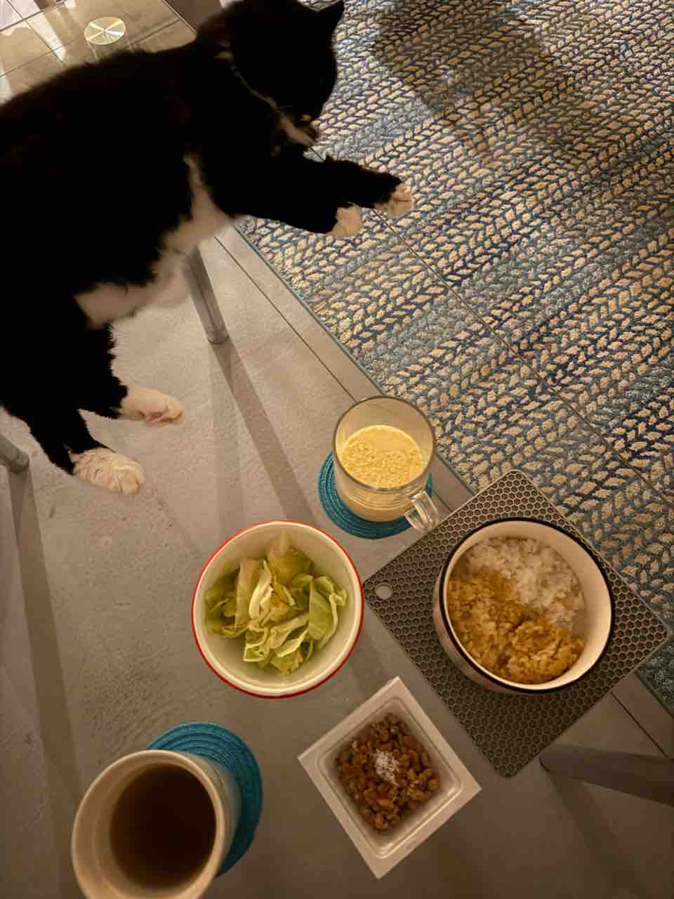 朝は蒸したまご、キャベツ、納豆、ごはん(白米とターメリックライス半々)