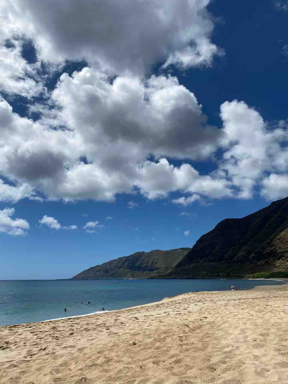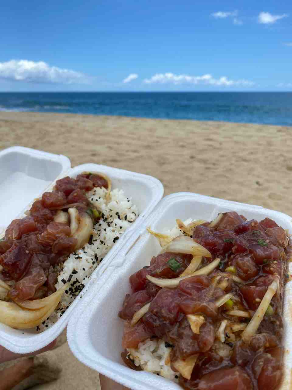 ビーチで海を見ながら夫ともぐもぐ。美味しすぎる。ピピカウラもポケも大好き。