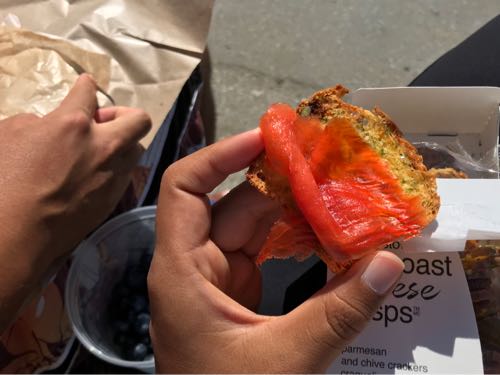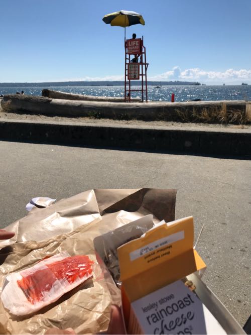 ベンチに座って、サーモンとチーズクラッカーを楽しむ♪どれもローカルだよ。