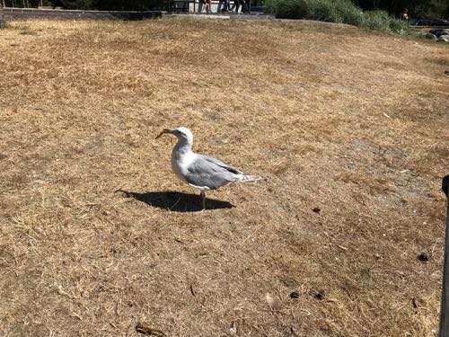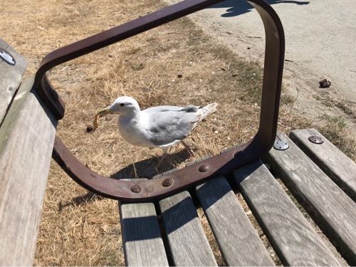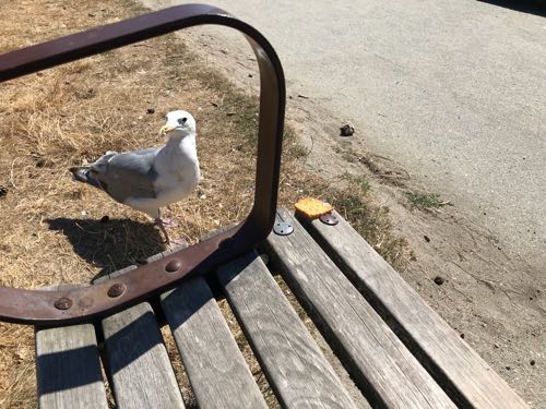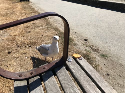 クラッカー、開けたときにいくつか落としちゃって、ベンチの隅に置いておいたら…。かもめがソロソロと知らんふりして近づいてきた。