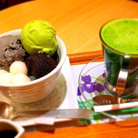 黒ごまあんみつ?に、抹茶アイスをトッピング~!