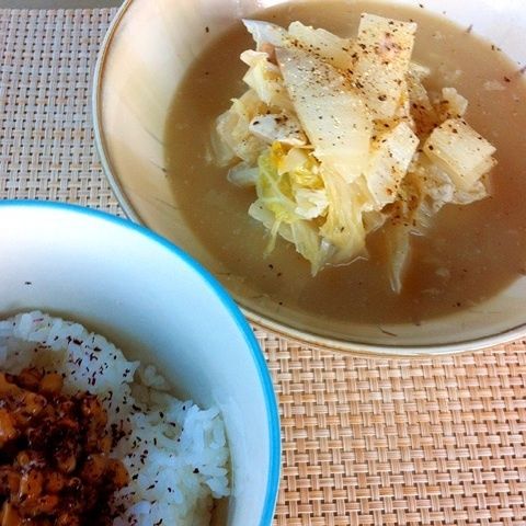 朝ごはんは、昨日の夜ご飯の残りの豆乳鍋のスープに、さらに白菜を大量に追加。