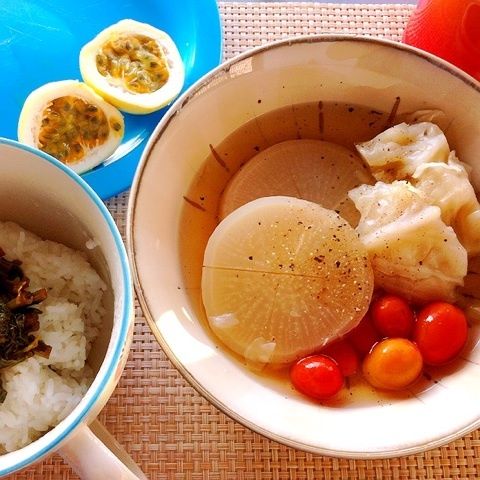 <当サイトではアフィリエイトプログラムを利用して商品を紹介しています> 2013年08月21日|雑記+ごはん日記 リリコイ朝ごはん #E朝 今日の朝ごはんは、大根とキャベツとミニトマトのスープ。 大根の葉っぱいためと、ごはん。 そしてリリコイ! ファーマーズマーケットで4個で1ドルだったのです。 食べ方を調べてみたら、種ごと食べれるんだとか。 このままスプーンですくって食べます。 お腹の中で芽が生えないといいけど。 1人だと、やっぱり同じメニューが続くよう。 もっと冷凍保存できるメニューにして、たくさん作って小分けにしよう!! iPhoneからの投稿 mixiチェック 「雑記+ごはん日記」カテゴリの最新記事 トラックバック