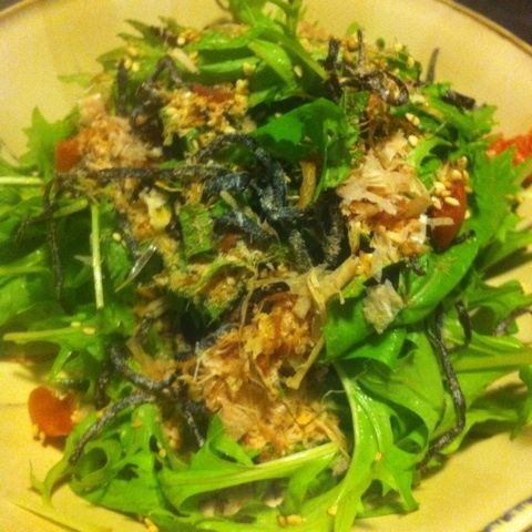 ナロファームのベイビー水菜に、鰹節、梅干し、塩こんぶ、白ごまをかけただけ。