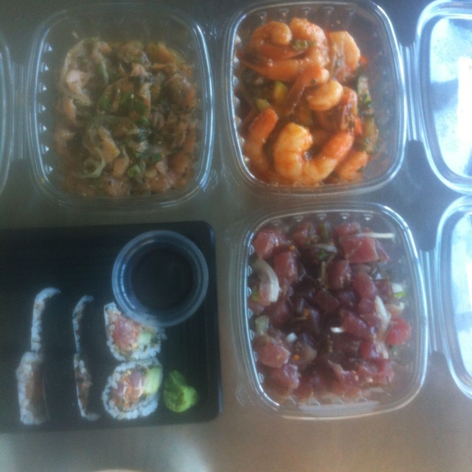 左上がスモークサーモン、右上はエビ、右下はマグロ。